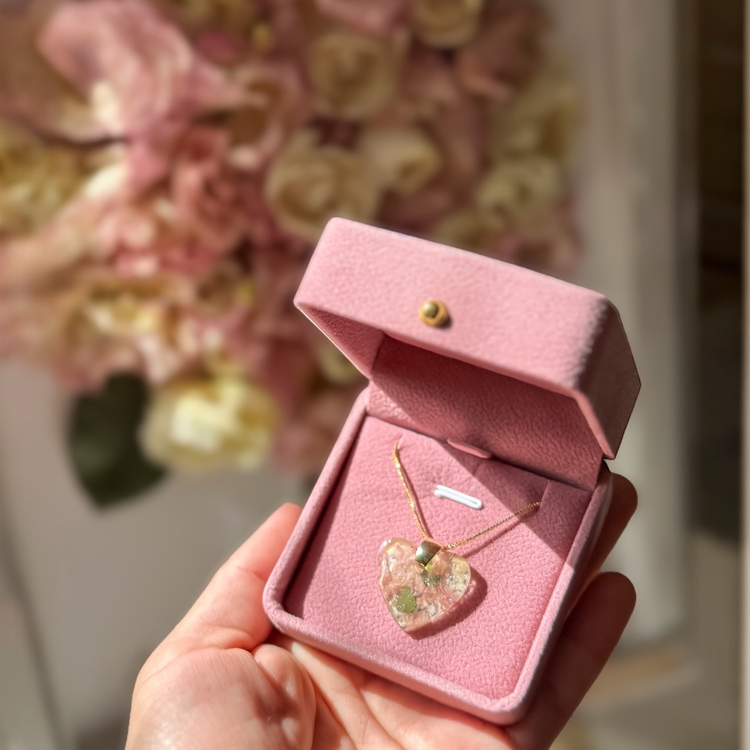 Aqui no ateliê eternizamos o seu buquê como uma jóia, em um lindo pingente no formato de coração de resina com as pétalas do seu buquê e corrente veneziana .