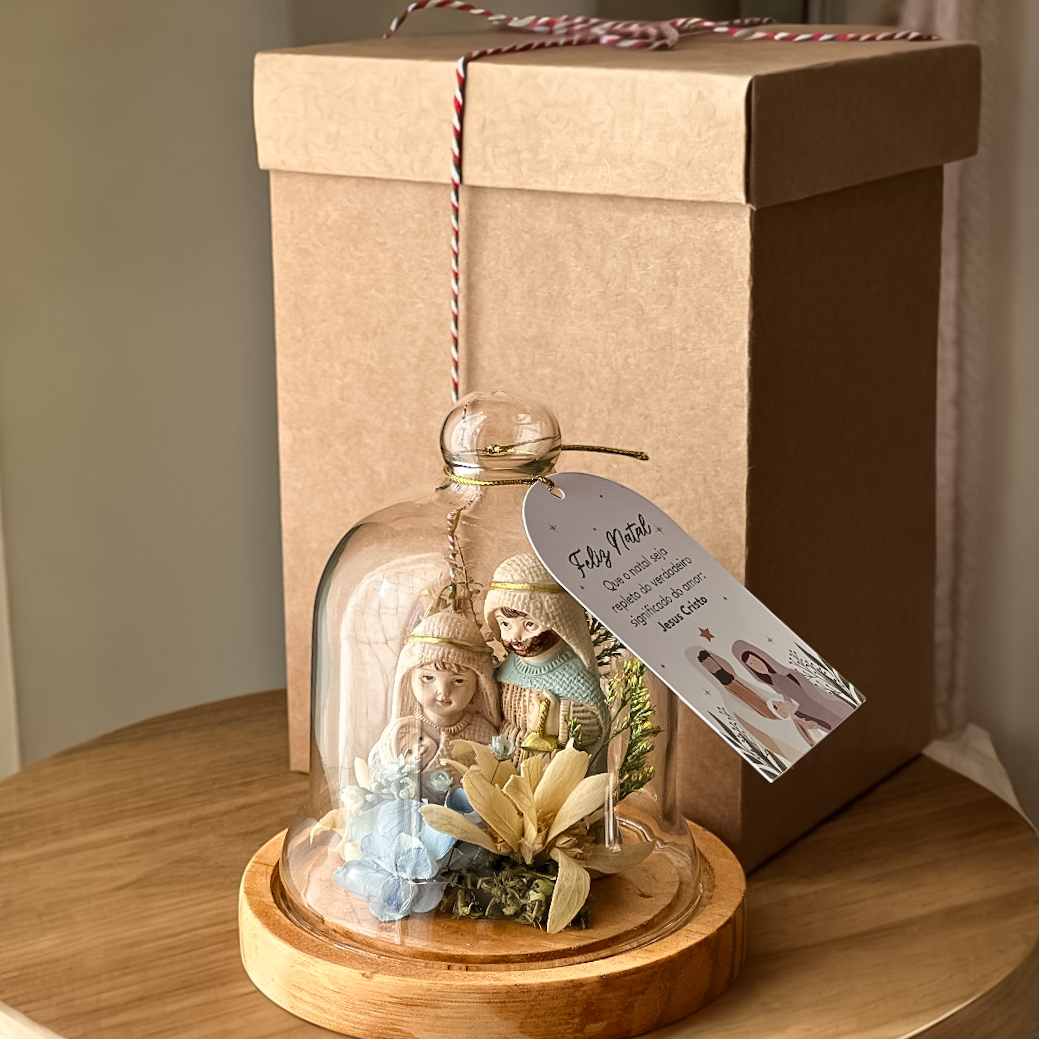 A Redoma Floral Sagrada Família fica linda na decoração, além de ser uma ótima opção para presentear aquela família especial que espera a chegada de um bebê, ou até mesmo os padrinhos de batismo.