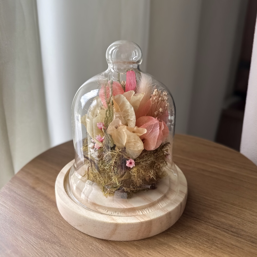 Redoma decorada com flores secas e preservadas.